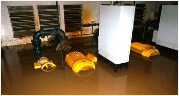 Uma conexão de saída de umas das Bombas de Recalque estourou e inundou a Casa de Bombas danificando as 4 Bombas de Recalque existentes.